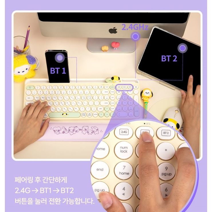 電腦用品品牌Royche 今日最新推出既BT21無線KEYBOARD 用藍芽可以連3個裝置 切換好方便 10米內都用到既藍芽連結 keyboard有位可以放電話 ipad 同埋apple pencil 仲有一個公仔添 總共7個款同顏色 size: 394x145x23mm 仲有同系列無線mouse可以襯埋一套 歡迎查詢🤗